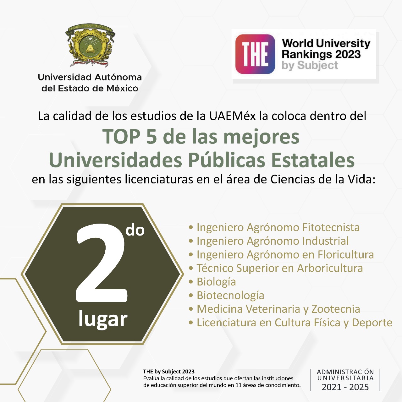 Compartir Lo anterior, de acuerdo con los World University Rankings 2023 by Subject de Times Higher Education (THE). Por la calidad de la educación que ofrece en el área de Ciencias de la Vida, la Universidad Autónoma del Estado de México (UAEMéx) es reconocida por los World University Rankings 2023 by Subject de Times Higher Education (THE) como la segunda mejor entre las Universidades Públicas Estatales y la cuarta de mayor calidad entre las Instituciones de Educación Superior mexicanas, incluidas públicas y privadas. La Máxima Casa de Estudios mexiquense ocupa la segunda posición entre las Universidades Públicas Estatales del país en el área de Ciencias de la Vida, que comprende los programas académicos de: Ingeniero Agrónomo Fitotecnista, Ingeniero Agrónomo Industrial, Ingeniero Agrónomo en Floricultura y Técnico Superior en Arboricultura; así mismo, Biología, Biotecnología, Medicina Veterinaria y Zootecnia, y la Licenciatura en Cultura Física y Deporte. En la clasificación mundial en esta área del conocimiento, que incluye 1,077 instituciones de educación superior y para la cual 19 instituciones mexicanas alcanzaron calificación, la UAEMéx aparece después del Instituto Tecnológico de Monterrey, la Universidad Nacional Autónoma de México y la Universidad Autónoma del Estado de Hidalgo. La evaluación en el área de Ciencias de la Vida de THE se basa en cinco indicadores (enseñanza, investigación, citas, internacionalización e ingresos de la industria), que se componen de 13 variables que miden el desempeño de una institución en grandes áreas como lo son la docencia, investigación, transferencia de conocimiento y perspectiva internacional. Navegación de entradas Monreal respeta la marcha en favor del INE del domingo EL INAI RESOLVIÓ QUE BANCOMEXT DEBE INFORMAR SOBRE FINANCIAMIENTO PARA REFINERÍA EN DOS BOCAS