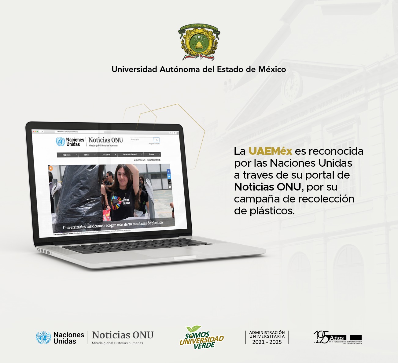Compartir La agencia de noticias de la Organización de las Naciones Unidas (ONU) reconoció el compromiso de la Universidad Autónoma del Estado de México (UAEMéx) con el medio ambiente, así como el entusiasmo de sus estudiantes, personal docente y administrativo que participaron en la Campaña de Acopio de Envases PET y Taparroscas, a la cual se refirió como un ejemplo exitoso de liderazgo en iniciativas sostenibles. “La campaña ha logrado una respuesta masiva en los espacios académicos, convirtiéndose en un proyecto inspirador que contribuye a la sostenibilidad y al uso de energías amigables con el medio ambiente”, destacó este organismo internacional en su página web y cuentas informativas de redes sociales. La ONU, a través de su publicación digital, (https://news.un.org/es/story/2023/06/1521672) resaltó el esfuerzo de la comunidad universitaria para promover la educación ambiental y fomentar la cultura del reciclaje a través de la recolección de plástico que se intercambia por paneles solares cuya instalación en planteles, facultades y centros de investigación permite la reducción del consumo de energía eléctrica. Gracias al acopio de envases, se han instalado paneles solares en los planteles de la Escuela Preparatoria “Lic. Adolfo López Mateos” e “Ignacio Ramírez Calzada”, ambos en Toluca; el de Texcoco, “Sor Juana Inés de la Cruz”, en Amecameca; “Dr. Pablo González Casanova”, en Tenancingo, la Facultad de Contaduría y Administración, Campus “Los Uribe”, entre otros. Como parte de la conversión de sus instalaciones y procesos a fin de consolidarse como una institución verde y sustentable, en la UAEMéx también operan sistemas de captación pluvial en el plantel «Nezahualcóyotl» de la Escuela Preparatoria, las facultades de Lenguas y Geografía, así como la Unidad Académica Profesional de Huehuetoca y el Instituto de Ciencias Agrícolas y Rurales (ICAR), que se suman a purificadores de agua y mingitorios secos, reciclaje de papel, unicel, fierro y chatarra, así como la recolección de residuos electrónicos y de manejo especial para evitar que sus materiales o sustancias dañen los recursos naturales. Navegación de entradas Se dice que Nadie es profeta en su tierra, pero Vanesa Martín sí lo es y lo confirmó INEGI da a conocer los resultados del Censo de Impartición de Justicia Agraria 2023
