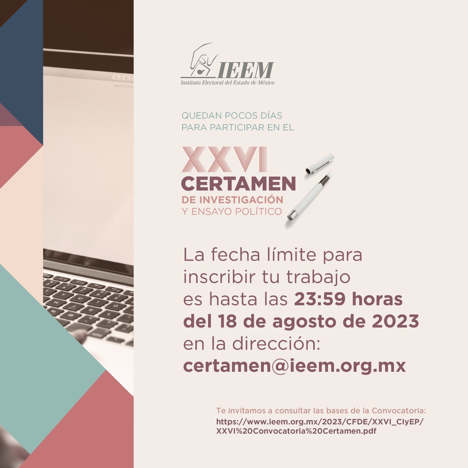 Compartir Este viernes 18 de agosto finaliza el plazo para inscribir trabajos en el XXVI Certamen de Investigación y Ensayo Político del Instituto Electoral del Estado de México (IEEM) en cualquiera de sus tres categorías: Tesis de Posgrado, Tesis de Licenciatura y Ensayo Político. Será las 23:59 horas de este día el último momento para ingresar al sitio web: www.ieem.org.mx y consultar la convocatoria para registrar tesis de posgrado, tesis licenciatura o ensayos que aborden temas vinculados al contexto político-electoral nacional y estatal como: Coaliciones de gobierno; Autonomía de las instituciones electorales; Reforma electoral; Representación proporcional; Segunda vuelta en elecciones, entre otros. Este certamen es organizado año con año, desde hace más de dos décadas, por el IEEM y tiene el propósito de promover la cultura política democrática, a través de la investigación académica, la libre expresión y la reflexión sobre lo social. Para participar, los escritos deben ser enviados al correo electrónico: certamen@ieem.org.mx, en un documento PDF especificando la categoría en que desean inscribirse, título del texto y seudónimo de la autora o autor. Entre los requisitos que deben cubrir los textos se encuentran los siguientes: Deben ser inéditos y originales. En el caso de las tesis, estas deben haber sido sustentadas en un examen, en un término no mayor a cinco años y anexar el acta correspondiente. En la convocatoria, misma que está disponible en la página: https://www.ieem.org.mx/2023/CFDE/XXVI_CIyEP/XXVI%20Convocatoria%20Certamen.pdf, es posible conocer todos los detalles sobre este certamen que ofrece premios económicos de hasta 20 mil pesos. Los ensayos, deben tener una extensión mínima de 20 cuartillas y máxima de 30, no se puede concursar con más de un trabajo, ni en más de una categoría y tampoco pueden registrarse aquellas personas que hayan sido ganadoras de este u otro certamen de características similares. Ya con los trabajos reunidos, se conformará un Jurado, que estará integrado por las Consejeras y el Consejero Electoral del Consejo General, miembros del Comité Académico del CFDE, así como por integrantes de la planta docente del CFDE quienes valorarán los textos tomando en consideración sus aportaciones académicas a la democracia, su contenido, su metodología y el desarrollo del tema. Para mayor información puedes acudir al Centro de Formación y Documentación Electoral del Instituto Electoral del Estado de México, Paseo Tollocan núm. 944, edificio anexo, planta alta, colonia Santa Ana Tlapaltitlán, C. P. 50160 Toluca, México, llamar al Tel. (722) 275 73 00, ext. 4300 y 4305, o bien mandar un correo electrónico a: certamen@ieem.org.mx. Navegación de entradas Reconoce Festival Internacional de Teatro Universitario puesta en escena de la UAEMéx TEMAS CENTRALES: Pronto se despejará la incógnita