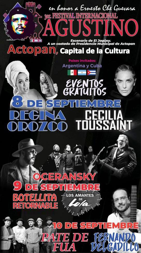 Compartir María Esther Beltrán Martínez Fotos: Festival Agustino Actopan Hidalgo efectuará la Tercera Edición del Festival Agustino Mañutzi con más de treinta actividades gratuitas, los próximos 8,9 y 10 de septiembre, informó Tatiana ángeles Moreno, Presidenta Municipal acompañada de Norma Araceli Méndez, Directora de Cultura del municipio. La programación está conformada por: Musette, tango, jazz, y tarantela, por el grupo Paté de Fuá, Edgar Oceransky, Fernando Delgadillo, Cecilia Toussaint. Además se contará con la Banda Sinfónica del Estado de Hidalgo; el espectáculo cómico-musical de Regina Orozco; el Concierto vocal operístico de Duo Di Voce; el Son Cubano de Juma y Jonny; la Coproducción México-Argentina de la compañía teatral Alianza Tanzler presentando «Von Kosser»; la presentación del documental sobre el «Che»; el espectáculo cómico, de Charros Mexicanos a cargo de Ok Circus; presentación musical de la Banda Botellita de Jerez, entre muchas cosas más. Actopan -declarada como Capital de la Cultura- en esta edición será un referente cultural en honor a Ernesto Che Guevara, quien fue médico, político, guerrillero, escritor, periodista y revolucionario. Tatiana Ángeles Moreno, indicó que se consolidarán diversas actividades musicales para todos los gustos, “lo cual permitirá a todos los actopenses disfrutar y apreciar la cultura a través de la música; además de contar con países invitados a Cuba y Argentina, consolidando a la Capital de la Cultura como un eje central de diversidad cultural nacional e internacional”. La gastronomía no puede dejarse a un lado por lo que se celebrará el segundo concurso del Ximbó el 10 de septiembre a las 12:00 hrs, platillo con orígenes Hñahñu, el cual es pollo en penca de maguey el cual otorgó al municipio el distintivo de pueblo con sabor, y es un referente de la gastronomía actopense. Norma Méndez presentó la programación e indicó que la inauguración será el próximo viernes 8 de septiembre en la Plaza constitución a las 10 de la mañana, después del acto protocolario se recordará a través de la música a Ernesto Che Guevara con Josette Zamora acompañada de Xoel Hernández. Se tendrá la presentación de la Banda Sinfónica del Estado de Hidalgo, con 50 músicos en escena. Y el grupo Calacas Jazz, La Cubetita nos brindará un concierto para los peques. “A las 16 horas haremos entrega de reconocimiento a Elena Poniatowska por su labor en pro de la cultura y las letras. Contaremos con la presencia de Xahá, agrupación musical de Querétaro que nos interpretará música tradicional Mexicana. Inés Montilla y Juan Martín Medina, (ambos músicos de Argentina) Ernesto Anaya (mexicano), inundarán de nostalgia el foro con el homenaje a Mercedes Sosa” enfatizó. El sábado a las 18 horas, tenemos el homenaje al Che con la presencia de Aleyda Guevara – comentó la responsable de cultura- .A partir de las 19 horas el escenario se iluminará con Edgar Oceransky, Botellita de Jerez y Los amantes de Lola, Rock y trova amalgamados en un mismo escenario. “El Domingo 10 de septiembre en la Plaza de la constitución tendremos la presencia de Paco Ignacio Taibo y posteriormente a Juma y Jonni quienes nos pondrán a bailar con son cubano. Para las 16 horas, en el Jaguey, iniciamos con una plática de Norberto Champa Galioti quien viene de Argentina a hablarnos sobre “El Che en Punta del este, un proyecto de integración sobre nuestra América”. Su voz hará eco en este pasaje del Che y sin duda, será un discurso con muchas anécdotas e ideas de nuestro homenajeado: Ernesto Che Guevara. Fernando Delgadillo nos deleitará a las 19 horas y el cierre de este Festival estará a cargo del grupo argentino Paté de Fuá. Platicas, música, teatro conforman esta programación. Gratuita, variada y con profesionales del arte. Es un gran cartel que no debemos dejar pasar”. Navegación de entradas Guía del Plato del Buen Comer, desde la UAEMéx Las Gotas de la Historia: hoy, Pedro de Alvarado