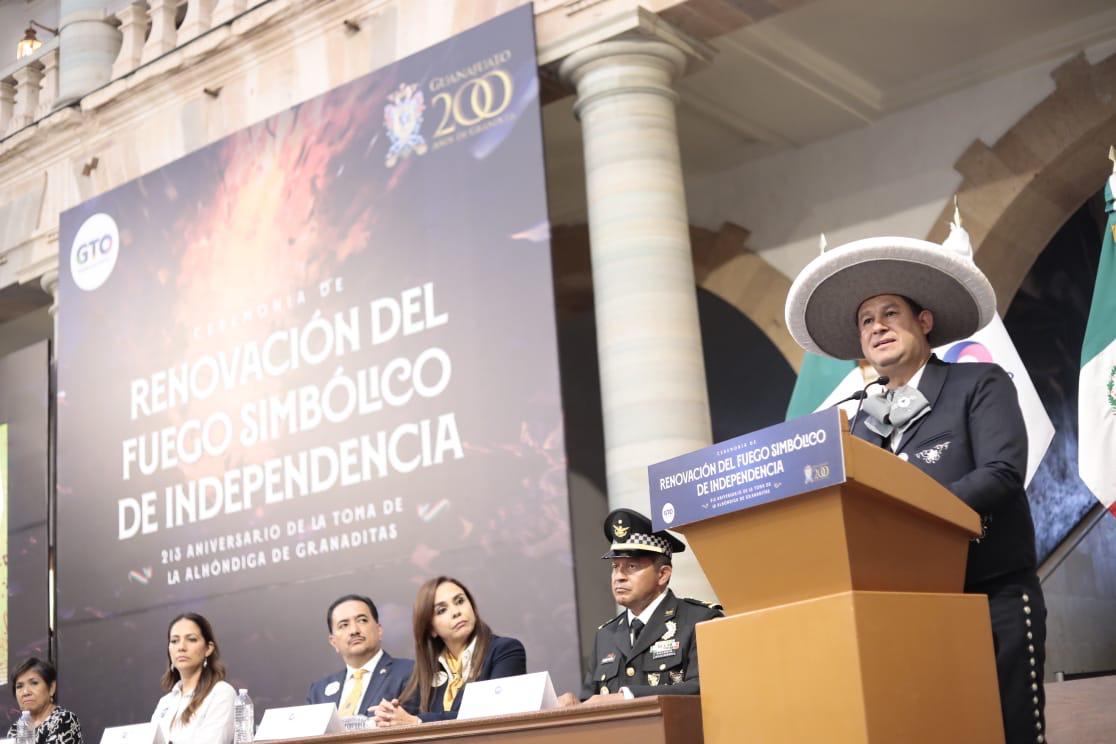 Compartir «Hoy Guanajuato vibra fuerte, como hace 213 años. Con pasión y con patriotismo. Porque la renovación del fuego simbólico, nos convoca a no olvidar las gestas heroicas de las mujeres y los hombres que nos dieron Patria». Así lo expresó el Gobernador del Estado, Diego Sinhue Rodríguez Vallejo, al presidir la ceremonia de Renovación del Fuego Simbólico de la Independencia en conmemoración del 213 aniversario de la Toma de la Alhóndiga de Granaditas por parte del Ejército Insurgente comandado por el cura Don Miguel Hidalgo y Costilla el 28 de septiembre de 1810. «Hace más de dos siglos, el fuego fue necesario para incendiar un símbolo de poder que mantenía oprimidos a los mexicanos. En el fuego que hoy renovamos, buscamos su luz para reafirmar nuestra identidad y nuestro sentido de pertenencia a esta bendecida tierra», dijo el Gobernador. Previo a la Ceremonia del Fuego Simbólico de la Independencia, el Gobernador Diego Sinhue, acompañado de las autoridades, participó en el tradicional Desfile Cívico – Militar y avanzó desde el Jardín de Embajadoras hasta el Museo Palacio de los Poderes. El Mandatario Estatal encabezó los Honores a la Bandera en el Jardín Embajadoras y a su paso por las calles de Guanajuato saludó a los asistentes. Las familias capitalinas, como cada año, observaron con alegría y júbilo el paso los contingentes, compuesto por alumnos de escuelas públicas y privadas, funcionarios de los tres niveles de gobierno, así como corporaciones de seguridad pública, asociaciones civiles y charros. Al llegar al ex Congreso del Estado, Rodríguez Vallejo subió al balcón del edificio para observar a el paso de los participantes. Después, por primera vez, el Gobernador se integró de nueva cuenta al desfile, a bordo de su caballo y con el atuendo típico de charro, para cabalgar hasta la Alhóndiga de Granaditas y encabezar la ceremonia del Fuego Simbólico. Esta ceremonia ocurre en el marco de las celebraciones por los 200 años de Guanajuato como Entidad Federativa, Libre y Soberana. Hoy se recuerda también la valentía de Juan José de Los Reyes Martínez Amaro “El Pípila”, quien con una piedra laja cargada en la espalda y armado de brea, aceite y ocotes, quemó la puerta de acceso a la Alhóndiga, lo que permitió el ingreso del Ejército Insurgente y la derrota del Intendente Juan Antonio Riaño y sus 600 hombres armados. Libre la entrada, las tropas de Hidalgo ingresaron a la Alhóndiga de Granaditas. Si bien, la lucha por la consumación de la independencia nacional tomaría 11 años, fue en Guanajuato donde se prendió la mecha de ese fuego de libertad que hoy se renueva. «Somos guanajuatenses, gente que se crece ante las adversidades; con ideales de libertad, de justicia y democracia, que han marcado la historia de México», dijo el Mandatario Estatal. El Fuego Simbólico de la Independencia representa la memoria de los actos heroicos que todas y todos los insurgentes realizaron durante la lucha de independencia para consolidar a México como una nación independiente. Este fuego se vio avivado el 20 de diciembre de 1823, cuando Guanajuato se proclamó como Estado Libre y Soberano, hecho del que estamos por celebrar los primeros 200 años. «En Guanajuato arde la llama de la educación y de la innovación en nuestras escuelas, en nuestras universidades, en nuestros centros de investigación, en nuestras empresas. Hoy le decimos a México y al mundo que en Guanajuato sigue encendido el fuego de la libertad y de la democracia; de la justicia y de la participación» dijo el Gobernador. Junto a Guanajuato, otros 18 estados son los fundadores de la nación mexicana: Estado de México, Oaxaca, Puebla, Michoacán, San Luis Potosí, Veracruz, Yucatán, Jalisco, Zacatecas, Querétaro, Sonora y Sinaloa, Tabasco, Tamaulipas, Nuevo León, Coahuila y Texas, Durango, Chihuahua, y Chiapas. En este evento estuvo presente Adriana Ramírez Lozano, Presidenta del Consejo Consultivo del Sistema DIF Estatal; Alejandro Navarro Saldaña, Presidente Municipal de Guanajuato; General de Brigada, Diplomado de Estado Mayor, Enrique García Jaramillo, Comandante de la 16va Zona Militar; Miguel Ángel Salim Alle, Presidente del Congreso del Estado; y Magistrada Ma. Rosa Medina Rodríguez, Presidenta del Supremo Tribunal de Justicia del Estado de Guanajuato. También asistió Jesús Oviedo Herrera, Secretario de Gobierno del Estado de Guanajuato; Libia Dennise García Muñoz Ledo, Secretaria de Desarrollo Social y Humano del Estado de Guanajuato; Jorge Enrique Hernández Meza, Secretario de Educación del Estado de Guanajuato; y Víctor Osvaldo González Márquez, Presidente del Consejo de Gobernadores del Distrito Múltiple D de México de Clubes de Leones. Asistió Óscar Arroyo Delgado, presidente de la Cabalgata de la Independencia Nacional; Sandra Míriam Ramírez, Gobernadora del Distrito B-5 del Club de Leones; General Brigadier, Diplomado del Estado Mayor, Vicente Dimayuga Canales, Coordinador Estatal de la Guardia Nacional en Guanajuato; y Eduardo de la Fuente, presidente del Club de Leones de Guanajuato A. C. Navegación de entradas Compromiso de la UAEMéx con el bienestar del medio ambiente Rinde Informe Presidenta del Tribunal Electoral del Estado de México