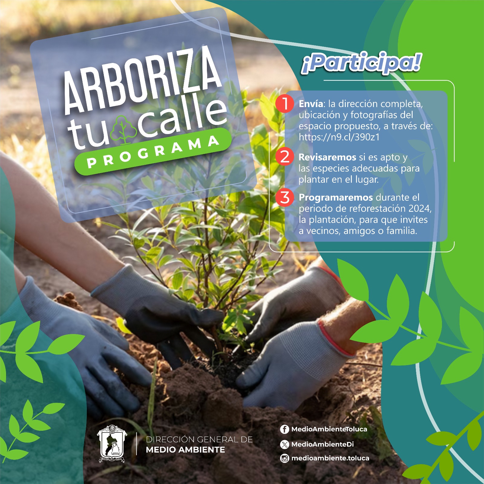 Compartir El Gobierno de la capital, a través de la Dirección General de Medio Ambiente, invita a participar en el programa Arboriza tu Calle. Este proyecto fomenta la forestación de las calles de Toluca en tres sencillos pasos: 1.- Registro en línea: Completa el formulario disponible en el enlace https://forms.gle/rSiqVwTubht9Ga7CA, donde deberás proporcionar la dirección completa, ubicación y fotografías del espacio propuesto para la reforestación. 2.- Evaluación: Expertos forestales revisarán las propuestas recibidas para determinar su viabilidad y seleccionar las especies adecuadas para cada ubicación. 3.- Plantación: Si tu propuesta es aprobada, se programará la plantación durante el período de reforestación 2024. Puedes invitar a vecinos, amigos y familiares para que se unan a la plantación de los árboles. Únete al compromiso con el medio ambiente y participa en el programa anual de reforestación. Este viernes 21 de junio, te invitamos a colaborar en la plantación de 3 mil árboles en la comunidad de Tlachaloya Primera Sección. Nos reuniremos a las 8:00 horas. Con tu participación, contribuimos juntos a una Toluca más verde y sostenible. Navegación de entradas Reitera UAEMéx compromiso con desarrollo sostenible: ofrecerá Cátedra de Desarrollo Humano para la Preservación del Planeta Fiesta de la Música, reconciliación y arte en Toluca