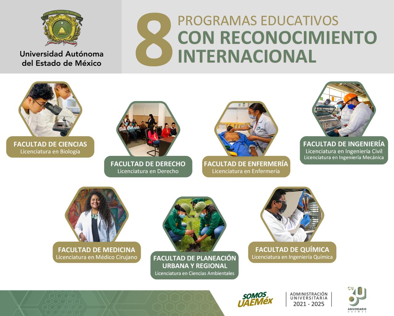 Compartir Con la certificación internacional de la Licenciatura de Médico Cirujano que se imparte en la Facultad de Medicina, la Universidad Autónoma del Estado de México (UAEMéx) suma ya ocho programas con reconocimiento internacional: Biología, de la Facultad de Ciencias; Derecho, de la Facultad de Derecho; Enfermería, de la Facultad de Enfermería y Obstetricia; Ciencias Ambientales, de la Facultad de Planeación Urbana y Regional; Ingeniería Civil e Ingeniería Mecánica, ambas de la Facultad de Ingeniería e, Ingeniería Química, de la Facultad de Química. Estos reconocimientos garantizan que los programas de estudios cumplen con estándares académicos de calidad reconocidos globalmente, lo que habilita a sus egresados para competir en contextos internacionales. Además, estas licenciaturas se distinguen por su pertinencia disciplinaria y por abordar transversalmente temas de inclusión, responsabilidad social, equidad y cultura de paz, en concordancia con las necesidades de la sociedad del siglo XXI. Cabe hacer mención que la UAEMéx cuenta con 157 programas educativos de licenciatura acreditados por distintos organismos certificadores como el Consejo para la Acreditación de la Educación Superior (COPAES) y los Comités Interinstitucionales para la Evaluación de la Educación Superior (CIEES). Navegación de entradas Urge a atender la muerte materna: investigadora de UAEMéx AGACHARSE Y LEVANTAR EL DEDO, DISTINGUEN A ANA LILIA