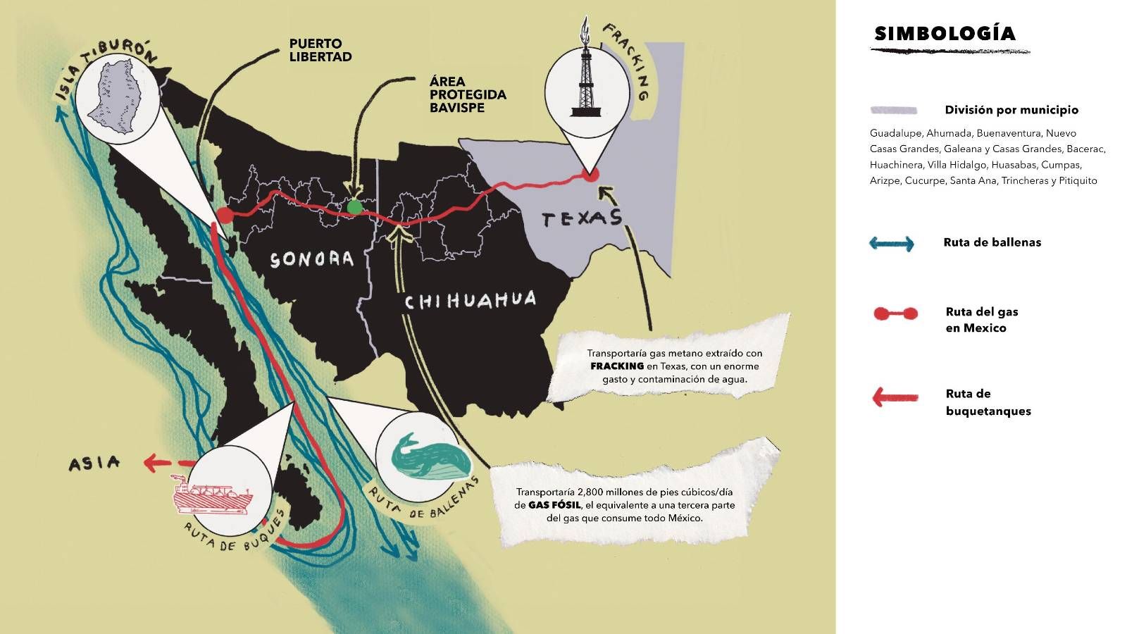 Compartir ● El proyecto Saguaro de exportación de gas natural licuado transformaría el Acuariodel Mundo, el Golfo de California, en una zona de sacrificio para la industria fósil.● El Golfo de California es hogar, permanente y de paso, del 85% de los mamíferosmarinos de México; el proyecto Saguaro supone el desplazamiento y/o muerte de lasballenas de estas aguas.● El gas fósil que se planea transportar por suelo mexicano supone agravar la crisisclimática, la cual ya tiene efectos devastadores en comunidades mexicanas.● El gobierno mexicano debe velar por los intereses y bienestar de la poblaciónmexicana y de su riqueza natural, y no por los intereses económicos de empresasextranjeras. Las organizaciones firmantes rechazamos la propuesta del proyecto de exportación de gas natural licuado (GNL) denominado Saguaro. De ser llevado a cabo, el proyecto tendría un impacto devastador para las ballenas en el Golfo de California, en la vida marina en general, en las poblaciones costeras y, de manera crucial, en el clima del planeta. Este proyecto responde a los intereses de la industria del gas fósil en EEUU, la cual busca acceder a mercados asiáticos para vender el excedente de gas que extrae por fracking de Texas. El Golfo de California es reconocido mundialmente por su biodiversidad, es considerado por la UNESCO como patrimonio de la humanidad, el icónico oceanógrafo, Jacques Cousteau lo bautizó como el Acuario del Mundo. En esta zona habita un total de 12,105 especies de flora y fauna, sus tranquilas aguas, no solo para las ballenas sino para múltiples especies, con áreas de crianza. El 39% de los mamíferos marinos del mundo están presentes en el Golfo de California. La baja perturbación por la ausencia de grandes buques ha permitido conservar este paraíso marino. La exportación de gas, con grandes buques de 300 metros de largo, terminaría con las condiciones que permiten la pacífica existencia de tantas especies. El megaproyecto pretende la exportación de gas fósil desde Puerto Libertad, una pequeña comunidad de pescadores. El gas que llegaría es extraído con la contaminante técnica de fracking, en Texas, la cual utiliza millones de litros de agua en un solo pozo y contamina el subsuelo, el aire y la tierra en la que se inyecta agua a presión con químicos cancerígenos para fracturar las rocas en las que se encuentra atrapado el gas. Para llevar el gas a la costa de Sonora, se plantea la construcción de infraestructura de 800 km de largo en nuestro país, atravesando sierras, comunidades, ríos, arroyos y zonas de importancia ecosistémica. Para recibir el gas y licuarlo, en Puerto Libertad se pretende construir una terminal delicuefacción, la cual, según la propia empresa mediría 400 ha, un tamaño equivalente a 70 veces el Estadio Azteca. Esta mega infraestructura estaría generando ruido y quemando gas metano en mecheros permanentemente, alterando las condiciones actuales de la comunidad de pescadores. Finalmente, para llevar el gas licuado a Asia, enormes buques de 300 m de largo, llegarían al puerto para transportar el gas. La frecuencia del tránsito de las embarcaciones y la ubicación de Puerto Libertad afectaría incluso el Santuario de la Vaquita Marina que se encuentra al norte pues convertirían el Golfo de California en una ruta de carga que perturbaría con ruido y riesgo de colisiones y derrames a los pacíficos gigantes marinos que hoy lo habitan. Una de las principales causas de muerte de las ballenas son las colisiones con grandes buques, el ruido que estos generan es ensordecedor para una especie que requiere del sonido para orientarse, encontrarse e incluso reproducirse. No hay proyecto que valga la desaparición de las ballenas de aguas mexicanas, mucho menos uno cuyo impacto sería agravar la crisis climática con las emisiones que provocaría la quema de ese gas, y que está planteado para el beneficio de empresas extranjeras y en detrimento de la población mexicana. La construcción de terminales de gas fósil, junto con el incremento del tráfico marítimo, no solo representan una amenaza significativa para la biodiversidad del Golfo de California, sino que también pueden marcar el principio de un daño irreparable a este frágil ecosistema. Las autoridades de México deben hacer todo lo posible en sus cargos para revertir los permisos otorgados a la empresa Mexico Pacific Land Holdings S. de R.L. de C.V. y salvaguardar la vida de las comunidades y la biodiversidad de nuestro país. Permitir el establecimiento de este proyecto resultaría en un daño irreversible para presentes y futuras generaciones. Firman:● Alianza Mexicana contra el Fracking, Altar Centro de Investigación, BCSicletos, Centro de Derechos Humanos de los pueblos del sur de Veracruz «Bety Cariño” A.C., Centro de Energía Renovable y Calidad Ambiental (CERCA), Centro Mexicano de Derecho Ambiental (CEMDA), Conexiones Climáticas, Consejo Civil Mexicano para la Silvicultura Sostenible, Corason, Defensa Ambiental del Noroeste (DAN), EsGasFósil, Frente de Pueblos en Defensa de la Tierra y el Agua de Morelos Puebla y Tlaxcala, Greenpeace México A.C., La Sandía Digital, MAREA (Mar y Educación Ambiental), Mares de México, Mar Libre, México Azul, Mujeres por la Sostenibilidad Ambiental y Alimentaria A.C (MUSAA), Museo de la Ballena y Ciencias del Mar, Planeteando, Territorios Diversos para la Vida, A.C. (TerraVida), UCIZONI, Viernes por el Futuro Chihuahua, , Wildlands Network México Navegación de entradas La Embajada reitera su preocupación Detienen a Iván Archivaldo Guzmán, de los capos más buscados
